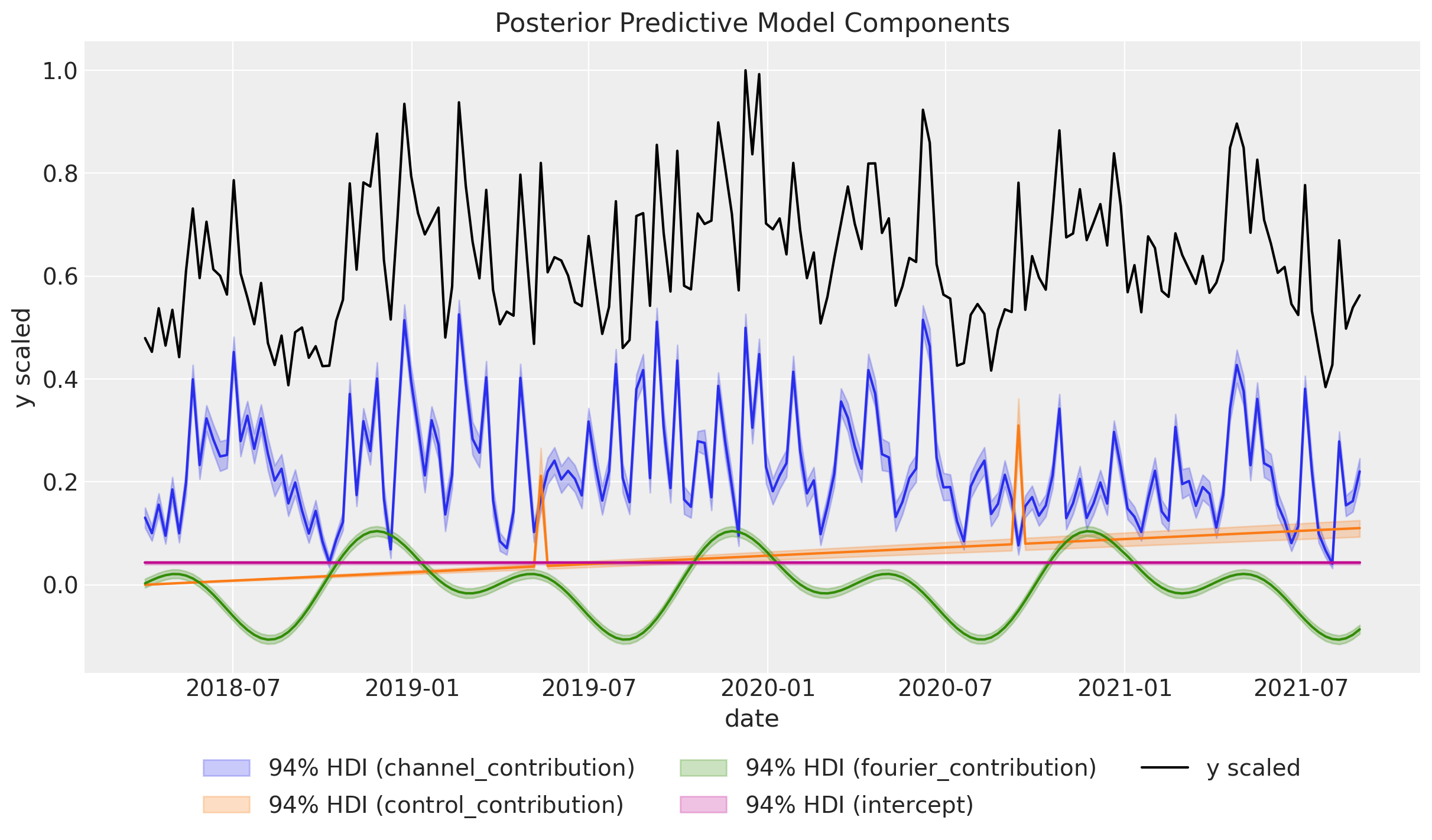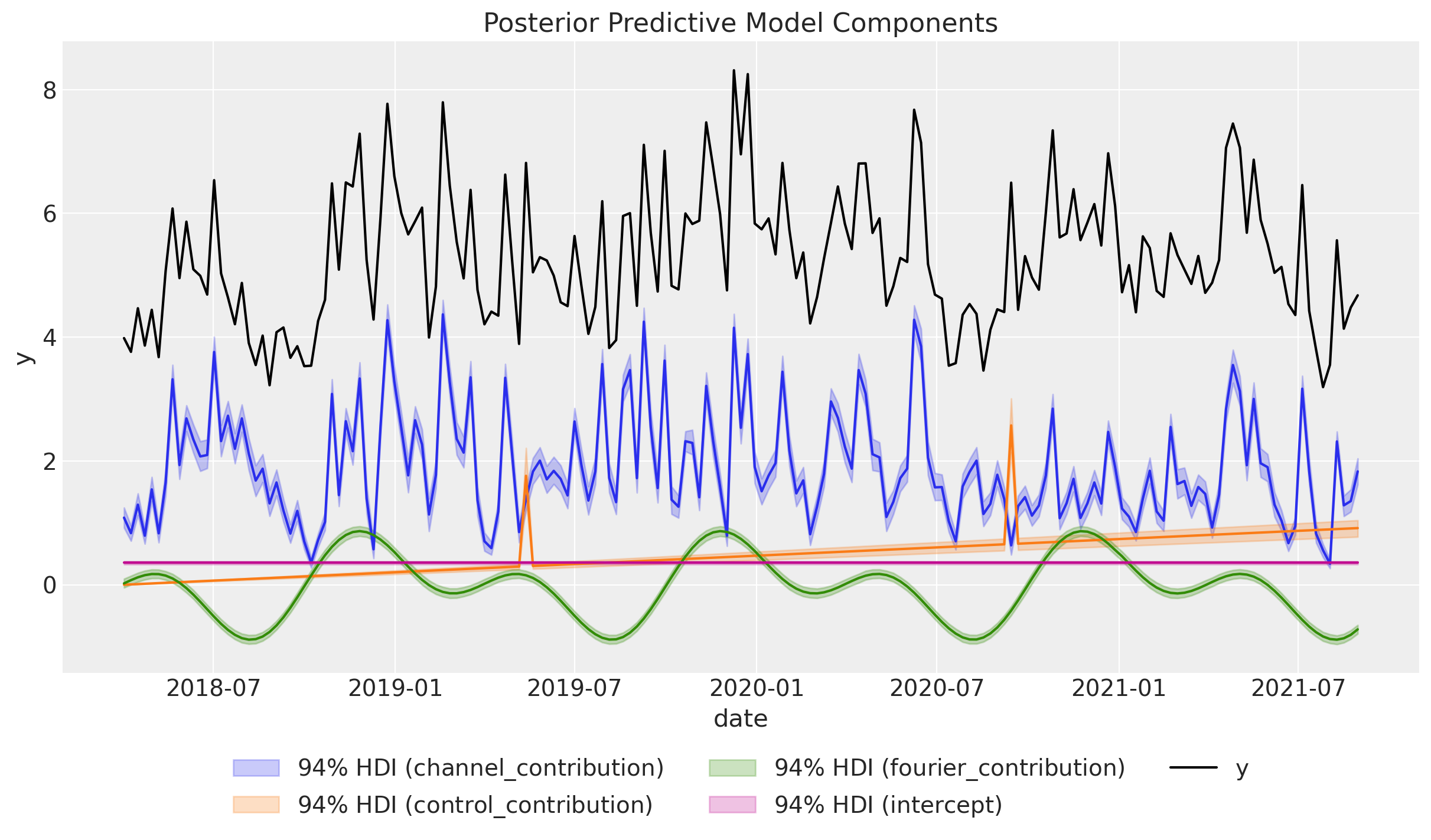 Time-varying Intercept: Capture time-varying baseline contributions in your model (using modern and efficient Gaussian processes approximation methods). That is, we allow the intercept term \(\alpha = \alpha(t)\) to vary over time. See mmm_tvp_example.